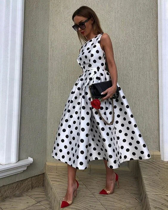 Перед вами класика — принт горошок, або як його ще називають стилісти polka dot. На даний момент покази мод рясніють романтичними вбраннями в чорно-білій колірній гамі в принт горошок. Щоб фігура виглядала струнко і витончено, варто придивитися до принту середнього діаметра, оскільки крупний горох може візуально розширювати проблемні зони.