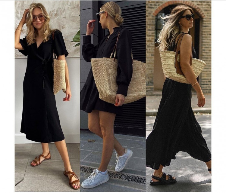 Чорний колір в одязі дуже класно поєднується з сумками з рафії або соломи (або їх імітації). За формою сумка може бути будь-якою, яка зручна саме вам: шопер, корзинка, клатч, кросбоді. Колір краще натуральний солом’яний. Бажано, щоб одяг на вас теж був з літніх тканин – бавовна, льон, віскоза (хоча і інші матеріали теж можна добре обіграти).