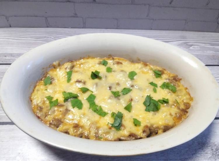 Відправляємо блюдо до духовки. Запікаємо при 180 градусах, поки сир не розплавиться, а зайва рідина не випарується (приблизно 10 хвилин). Ті, хто не любить, коли сир запікається задовго, можуть посипати сиром за 5 хвилин до закінчення приготування.