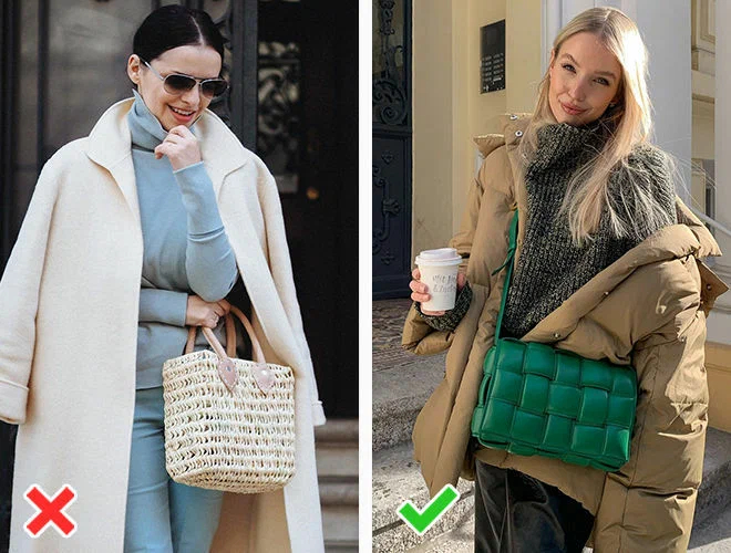 Ні: солом’яна сумка. Як би не хотілося атмосфери тепла та сонця, плетеною сумочкою літо не повернути. Вона чудово виглядає з лляними сукнями та босоніжками і зовсім не доречно з теплим пальто та черевиками.