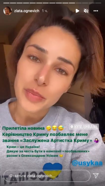 Днями, в інстаграм-сторіс українська виконавиця Злата Огнєвіч повідомила своїх підписників про те, що російським керівництвом її було позбавлено звання заслуженої артистки Криму.