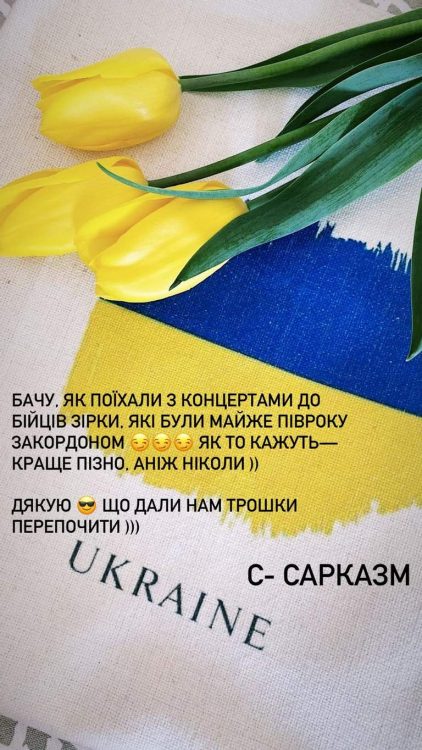 “Бачу, як поїхали до бійців із концертами зірки, які були майже пів року за кордоном. Як то кажуть – краще пізно, аніж ніколи. Дякую, що дали нам відпочити. Сарказм” – різко, проте, відверто з, підписавши свою зазначила знаменитість, підписавши свою світлину.
