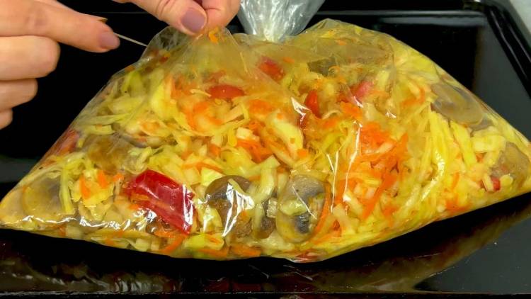 Нарізаю цибулю, моркву, солодкий перець і додаю до капусти. Додаю 50 мл олії, перемішую і перекладаю в пакет для запікання. Додаю смажені гриби та зав’язую пакет.