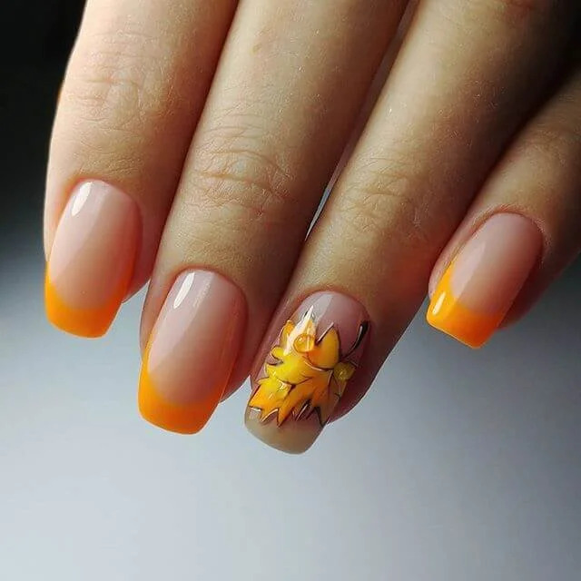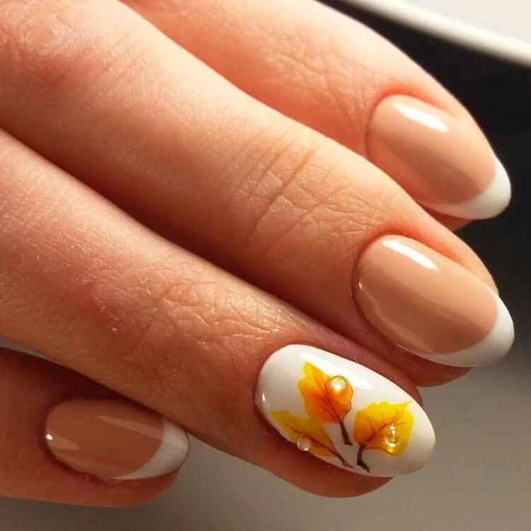 Також можна зробити класичний френч, і на один ніготь додати малюнок, щоб зробити дизайн максимально символічним, що доповнює осінню атмосферу. До речі, такий дизайн дуже красиво виглядає на коротких нігтиках овальної форми.