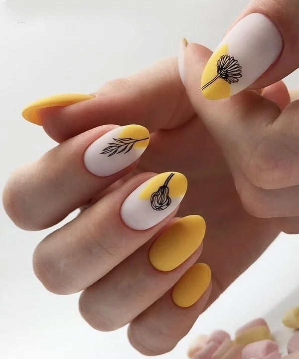 Восени 2020 в тренді також спокійні варіанти манікюру, з простим декором. Наприклад, можна взяти два кольори – білий і жовтий. За допомогою даних відтінків зробити нехитрий фон (можна монохром), і намалювати або наклеїти невеликі малюнки, відповідні символіці прийдешнього сезону.