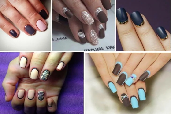 Матове покриття без будь-якого блиску вселюдно виглядає блискуче. Все тому, що тут використовуються зовсім інші акценти. Наприклад, темне нігтьове ложе і світлий  малюнок. Але якщо іскорок все-таки хочеться, включати в дизайн золотисту фольгу і інші помітні матеріали не забороняється.