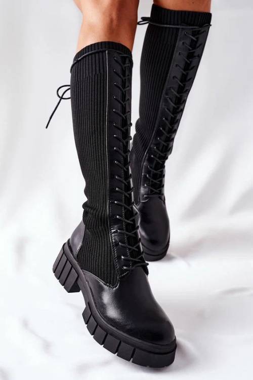 Високі чоботи із вставками із щільної гумки, на тракторній підошві, прикрашені витонченою шнурівкою — ще одне вдале придбання зимового сезону. Дані моделі чобіт підійдуть на будь-який обхват халяви, при цьому ви почуватиметеся комфортно та впевнено.