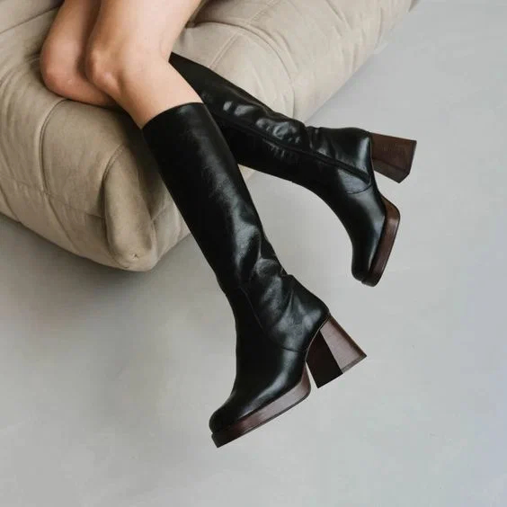 Мінімалістичні високі шкіряні чоботи на громіздкому підборі – практична модель взуття, яка прослужить вам далеко не один сезон.