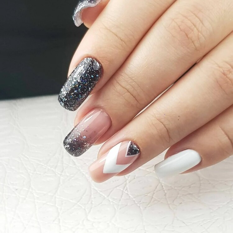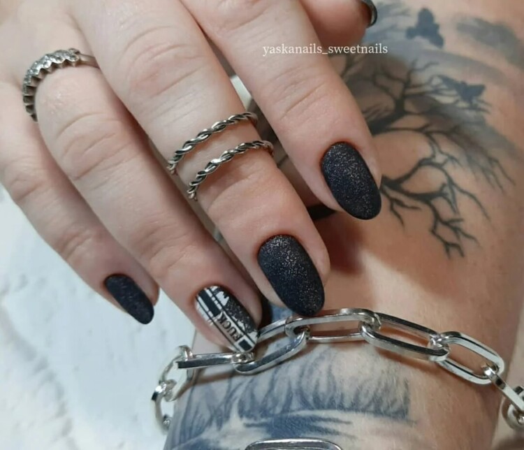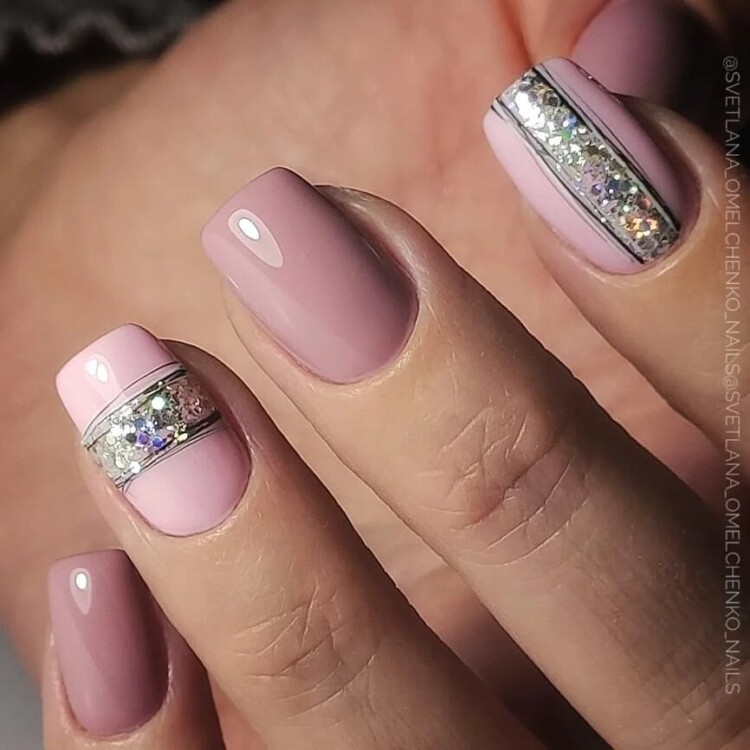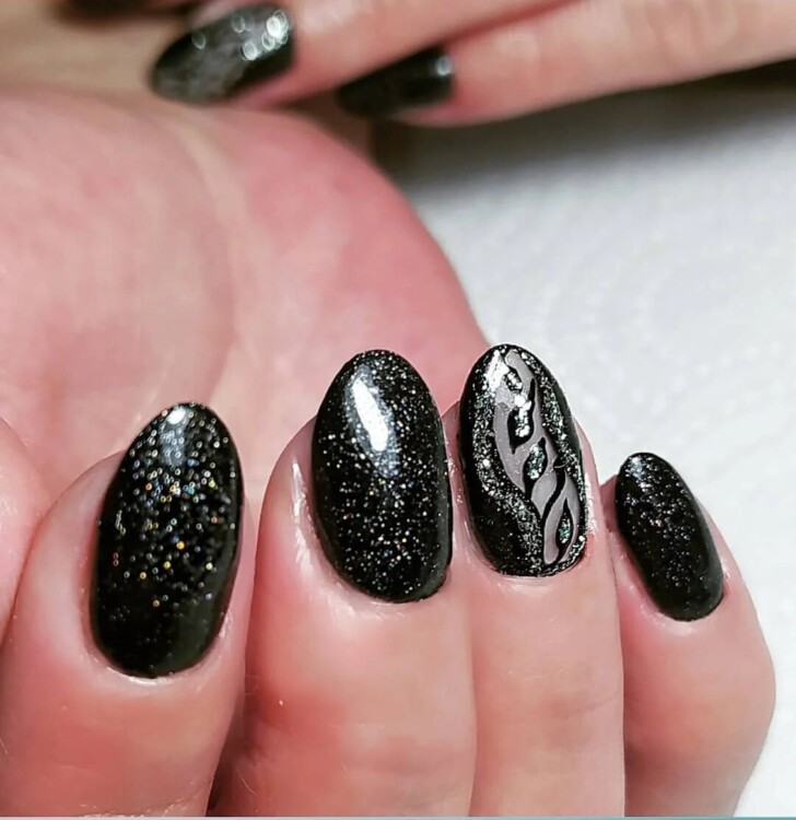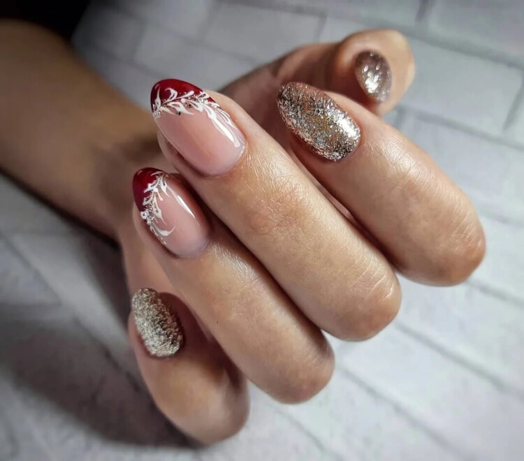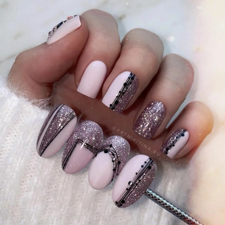 Більш складний дизайн можна зробити, звернувшись до глітеру або втірки. Такий матеріал робить нейл-арт більш статусним і багатим. Він ідеально виглядатиме з насиченими кольорами лаку, популярними техніками і новорічними малюнками.
