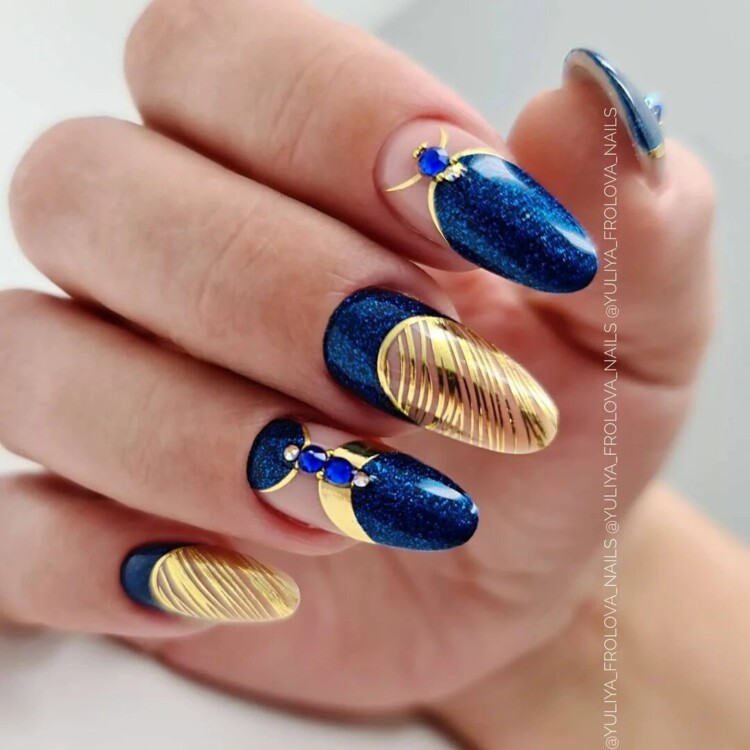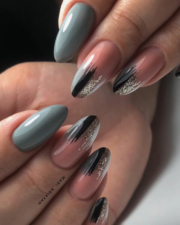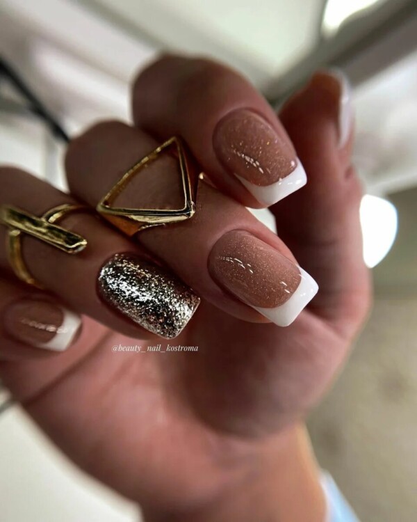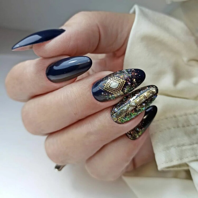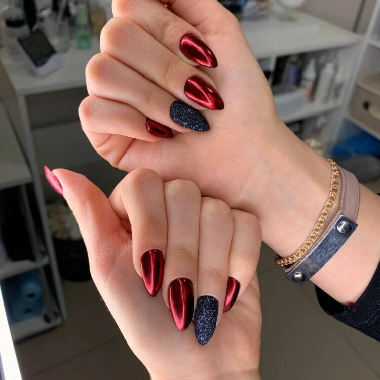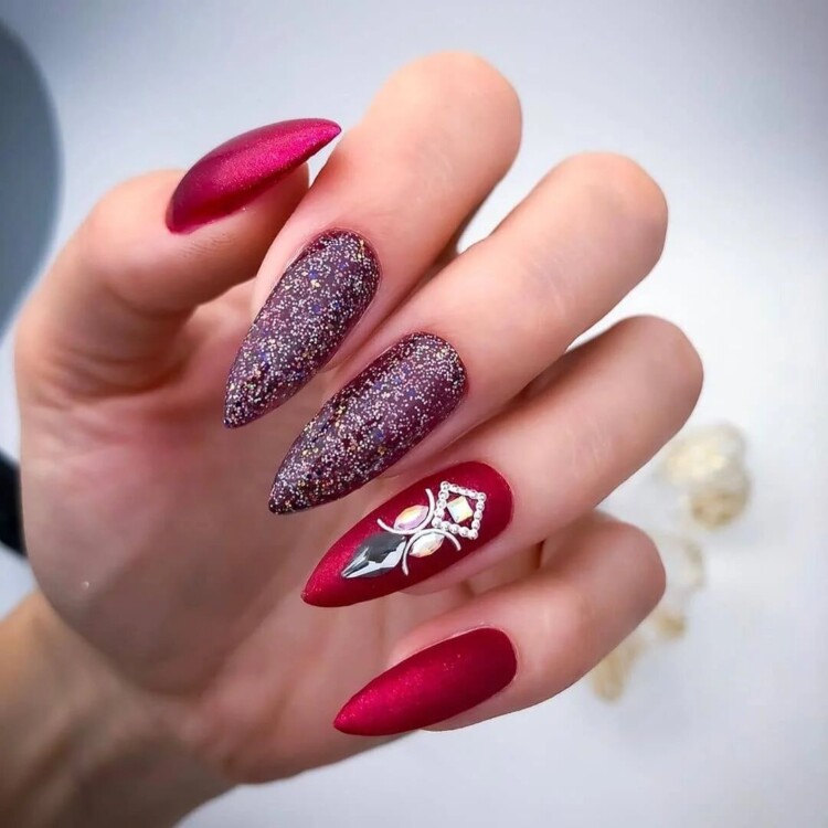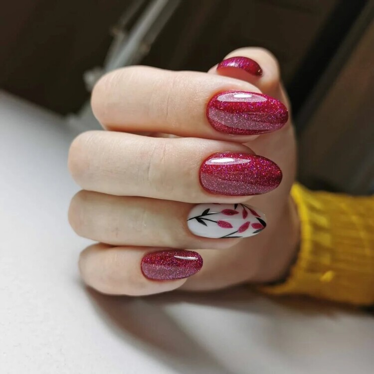 Більш складний дизайн можна зробити, звернувшись до глітеру або втірки. Такий матеріал робить нейл-арт більш статусним і багатим. Він ідеально виглядатиме з насиченими кольорами лаку, популярними техніками і новорічними малюнками.